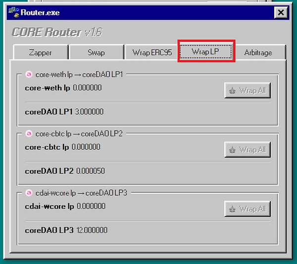 Once the Router window is opened, click on the Wrap LP tab. You will see three different sections, displaying each of the former LP tokens. If your wallet holds any of these tokens, you will be able to click the Wrap All button. Confirm the transaction and give the interface up to a minute to catch up.