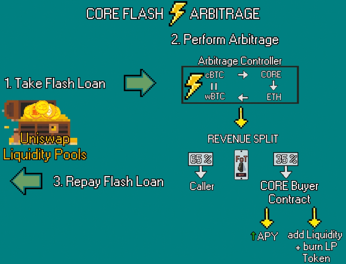 The contract takes a Flash Swap from a pool and performs the arbitrage strategy which was previously selected. The revenue generated through the arbitrage is split between the Caller and the CORE Buyer Contract. The ratio depends on the Fee on Transfer (FoT) function being on or off for the performed strategy. When an arbitrage strategy is performed with FoT on, the max revenue split for the Caller is 10% and 90% for the CORE Buyer Contract. If FoT is turned off, the maximum revenue for the Caller is 65% while the CORE Buyer Contract receives 35%.