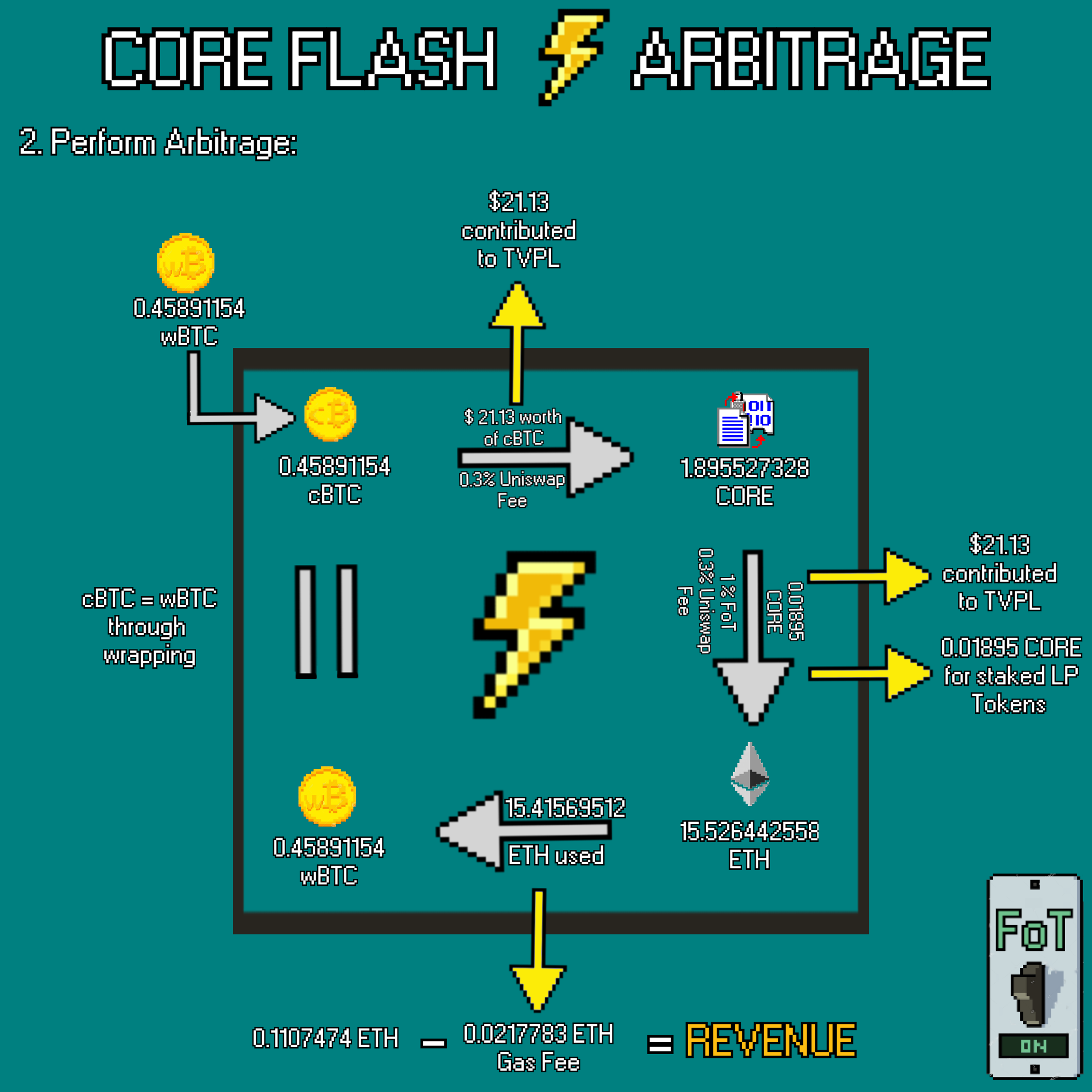 Due to the special rules in CORE’s ecosystem a Flash Arbitrage performed on a CORE pool has several positive effects. First of all, every 0.3% Uniswap Fee charged for transactions are directly contributed to the Total Value Permanently Locked (TVPL). In this example it happens between cBTC and CORE and between CORE and Ethereum. Another beneficial effect on the system is the 1% Fee on Transfer which stayed active in this strategy, generating 0.01895 CORE for the CORE/ETH LP token holders.
